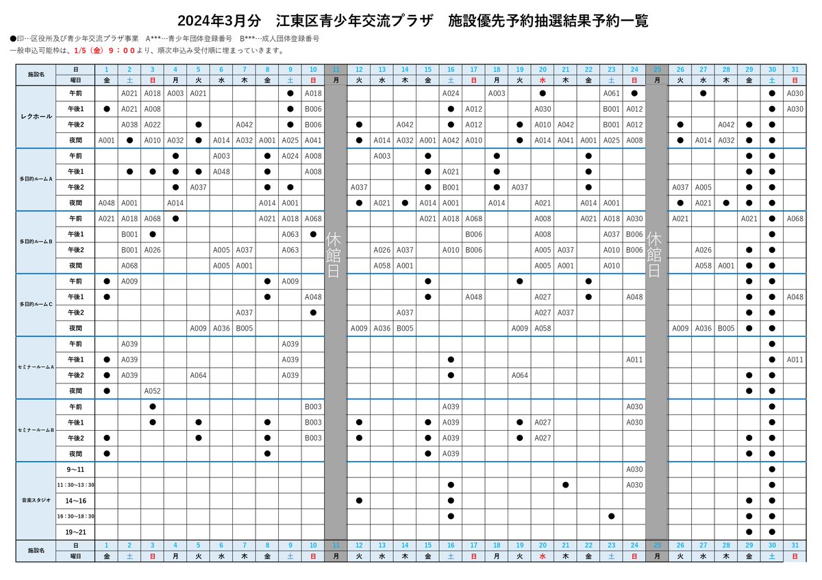 3月分の施設一般申込は、 令和6年1月5日(金)午前9時から ネット受付および施設窓口にて同時に受付を開始いたします。
