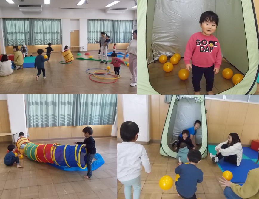 集会室にトンネル、トランポリン、ウエイブバランス、ボールなどを出して自由に遊ぶ時間でした。