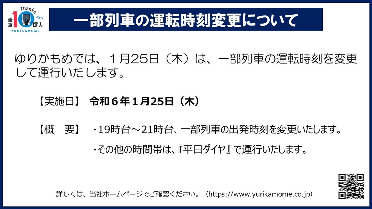 ゆりかもめでは、1月25日(木)は19時台~21時台の一部列車の運転時刻を変更して運行いたします。その他の時間帯は 「平日ダイヤ」 で運行いたします。詳しくは弊社ホームページに掲載しております。