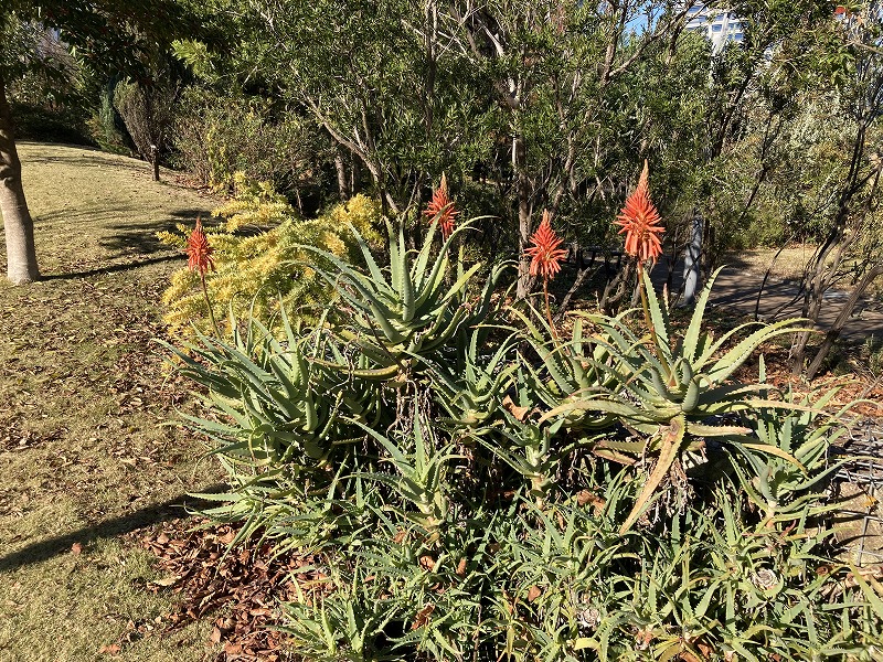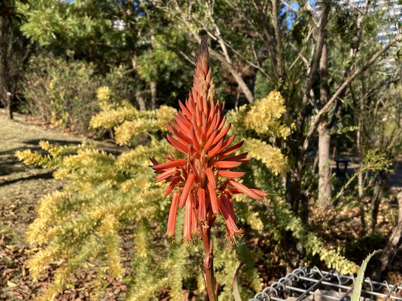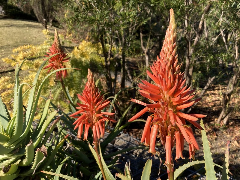 真っ直ぐに伸ばした花茎の先に総状花序を出し、多数の花を下向きに咲かせます。蕾の段階では鮮やかなオレンジ色、咲き進むと黄色に変化します