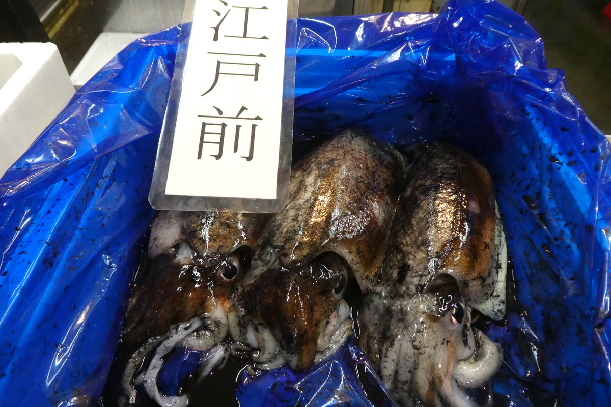 【コウイカ】「江戸前」と書かれたこの姿。江戸前ずしのイカといえば、このコウイカが筆頭ではないでしょうか。墨にまみれた格好から、別名「すみいか」。秋から春に旬を迎えますが、夏に出てくる「新いか」は、このコウイカのこと。身は肉厚で甘みがあり、歯切れがよく、すし飯との相性抜群です。