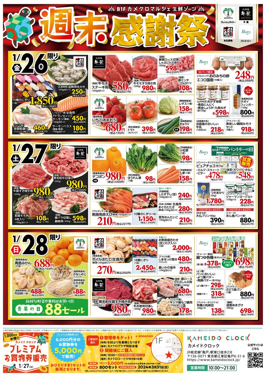 【🍲1/26(金)~1/28(日)🍲】B1F #カメクロマルシェ にて「寒のうまいもの市」が開催! 「お肉処牛蔵・本庄鮮魚・フレッシュダイトー・パントリー」各店自慢の商品がお買い得な3日間となっております!お見逃しなく🩷 今週末はカメクロマルシェへ!詳細はチラシをご確認ください♪ #カメイドクロック