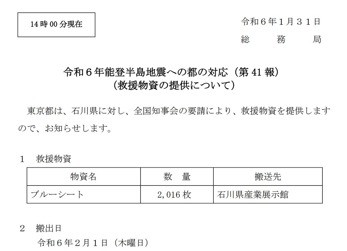 石川県から全国知事会に支援要請のあったブルーシートを、東京都が明日2016枚送ります。都ではこれまでに1月中旬に3,552枚、今週は2,502枚と提供してきましたが、要請があり追加。これで合計8070枚となりましたが、今後も現地のニーズに合わせて支援していきます。