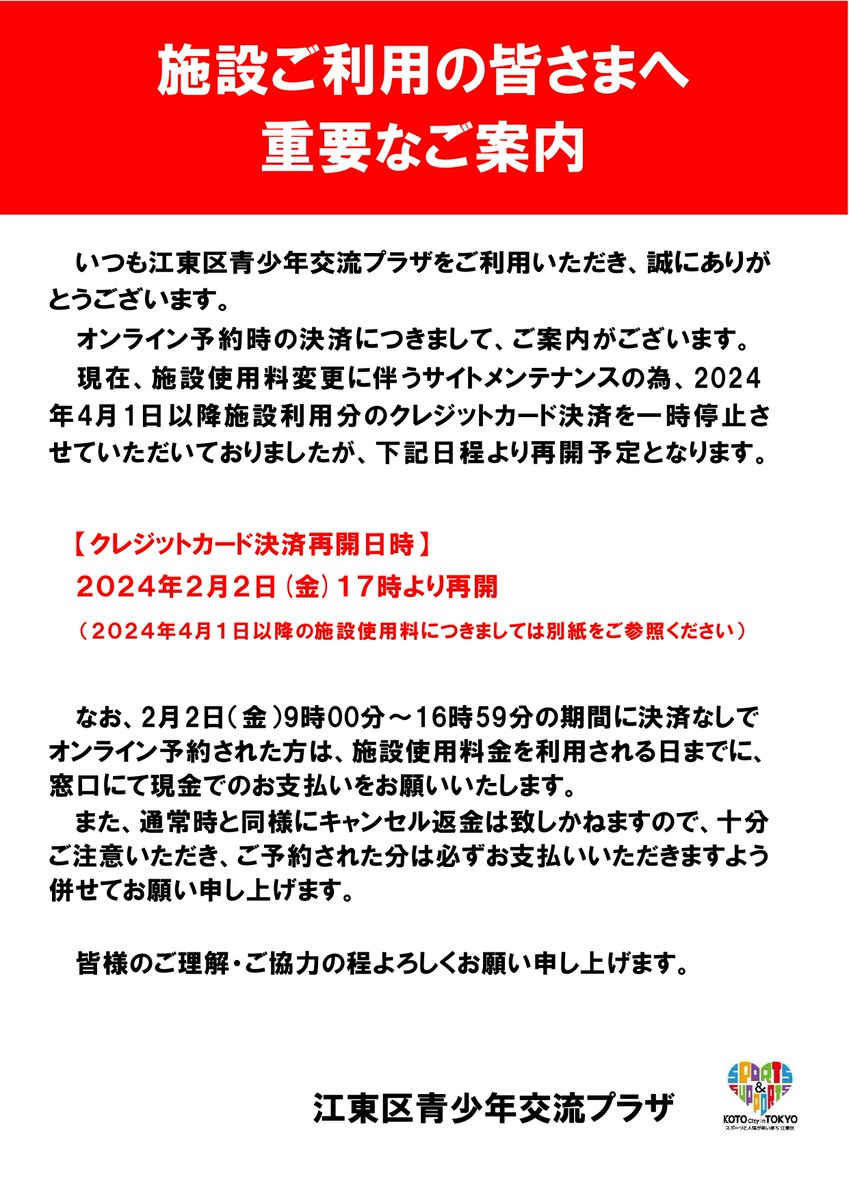 ⚠️重要なおしらせ⚠️ 2024年4月1日以降利用分の オンライン予約時のクレジットカード決済を 一時的に停止しておりましたが、 2月2日(金)17時より再開いたします。 詳しくは『重要なご案内』等よりご確認ください。 #江東区 #青少年交流プラザ