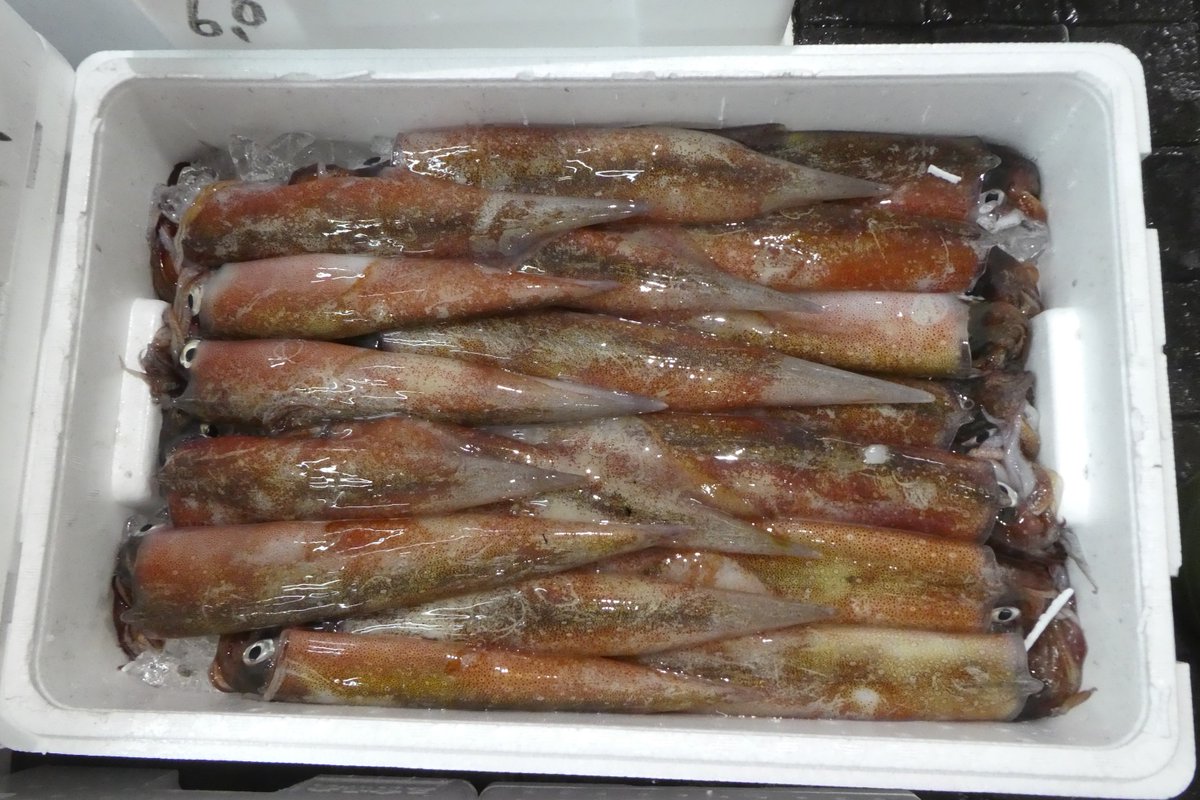 【ヤリイカ】同じヤリイカ科のケンサキイカに似ていますが、触腕がケンサキイカに比べて短く、その吸盤も極めて小さい。オスはメスよりも大きくなり、オスの胴の先端は、成長に伴い槍のように尖ってきます。刺身で食べるとやわらかく甘みがあります。小型の子持ちは、これからの時期に見逃せません。