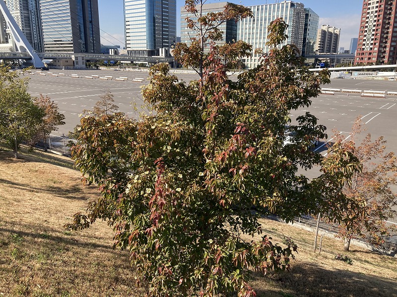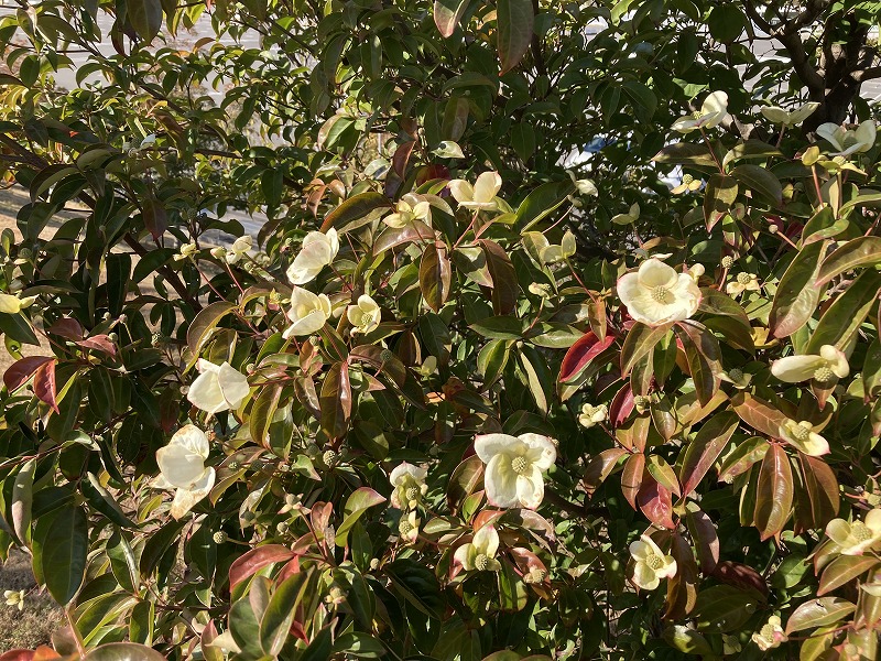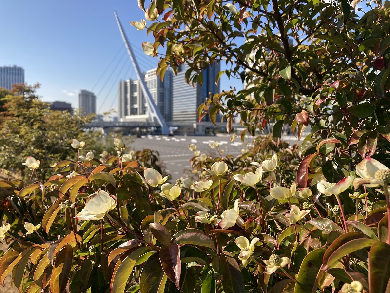 二季咲き品種で秋にも開花しやすく、シンボルプロムナード公園「夢の大橋」袂の本木は、毎年冬のこの時期まで花を咲かせます。