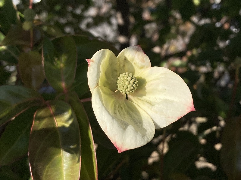 新芽の紅色が特徴的な常緑性のヤマボウシです。直立性の樹形が空高く生長することから「サマースカイツリー」と命名されました。