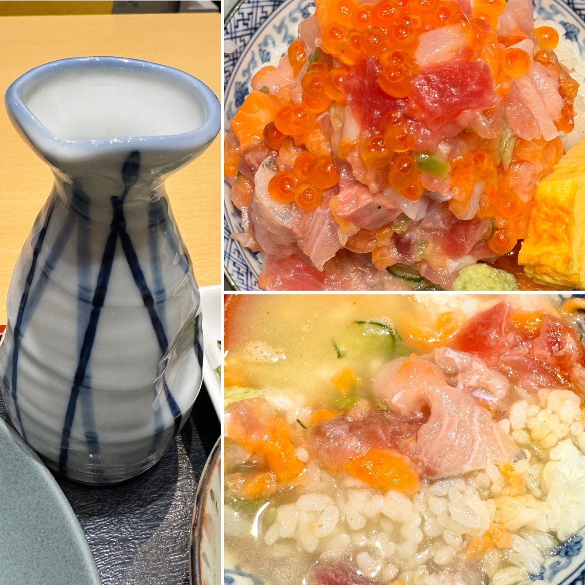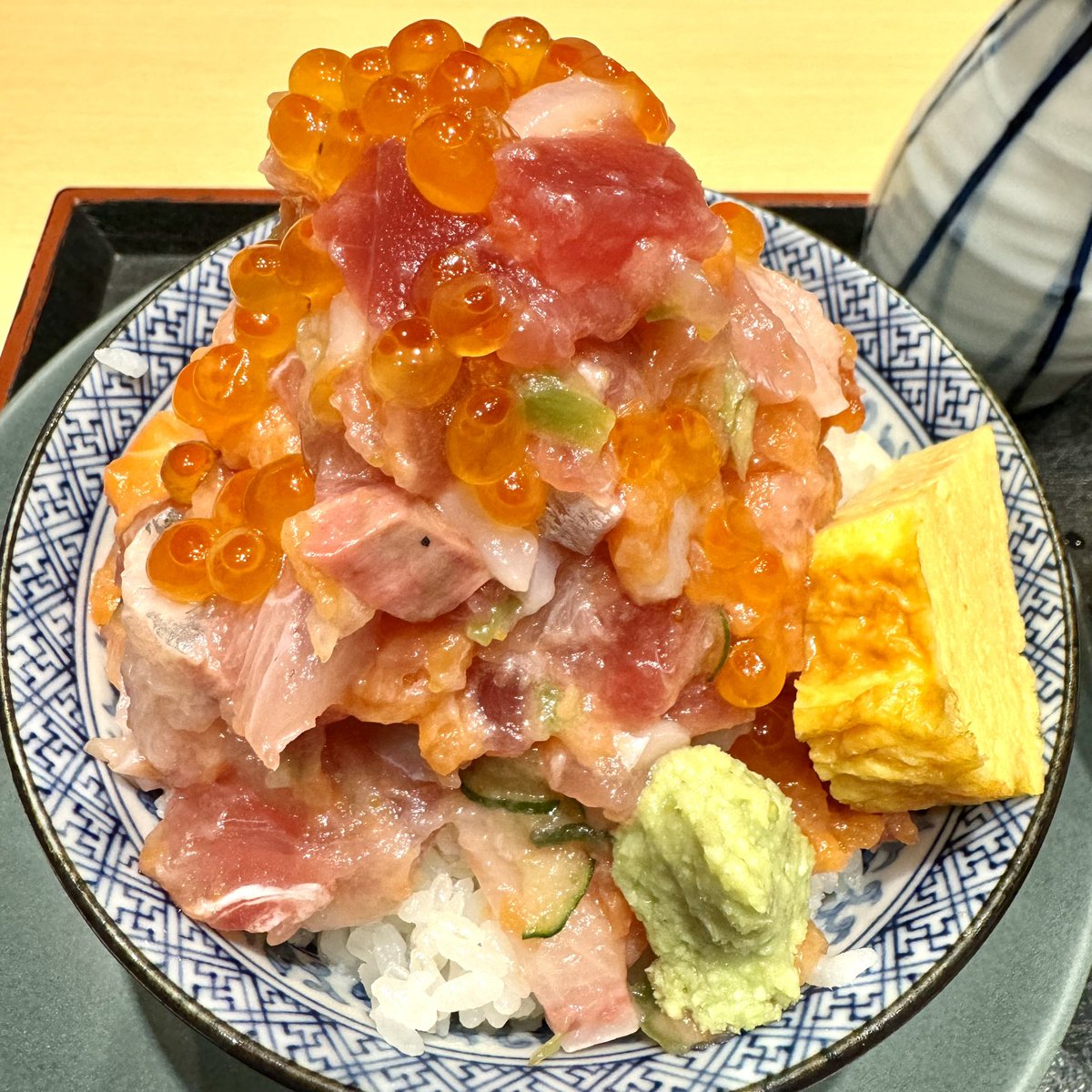 堂々と聳え立つ「粋のや」(豊洲6-5-1 水産仲卸売場棟3F)の海鮮丼「いただき丼」(2400円)がコレ!いくら、まぐろ、ぶり、サーモン、鯛、ねぎとろ、いか、数の子がてんこ盛り!🤗半分残して徳利に入ったコラーゲンたっぷり熱々「魚介だし」を注げば、第二形態の高級「海鮮茶漬け」の出来上がり!😋