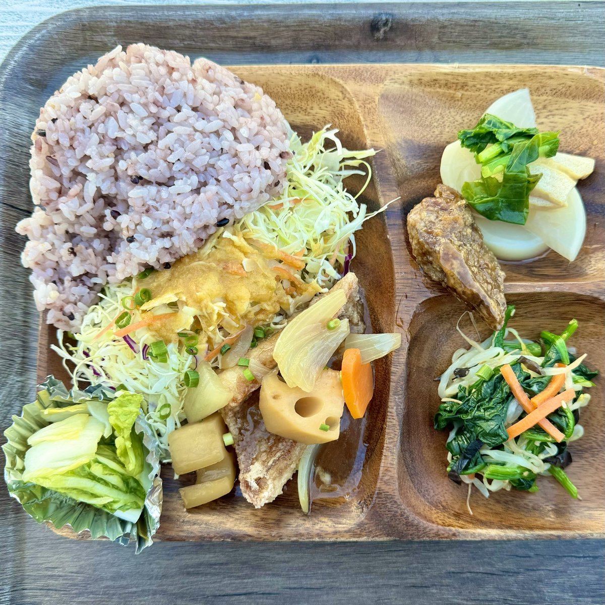 もしも願いが叶うなら、毎日ここで朝昼晩食べたい!🥹江東区ヘルシー&オイシーのトップランナー「うみねこ食堂」(新木場3-6-6)。今日は「宮城県産天然赤魚〜根菜の黒酢あん〜」(900円)!もう何から何まで全部美味しい!栄養成分表まで公開してる!😋材木屋さんの中にあるのも楽しくて大変良き! twitter.com/minamisuna1/stat..