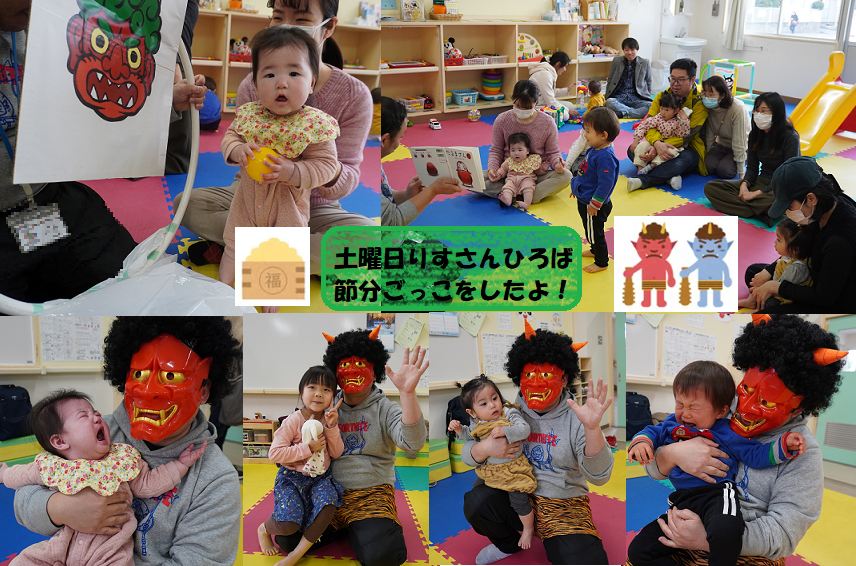 ボールを的に投げ入れる鬼当てゲームをしたり、鬼さんとの撮影会もありました。初めて鬼さんに会ったお友達もいましたよ。