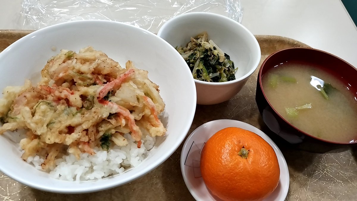 かき揚げ丼、青菜とモヤシのナムル、カブの味噌汁、みかん🍊です。