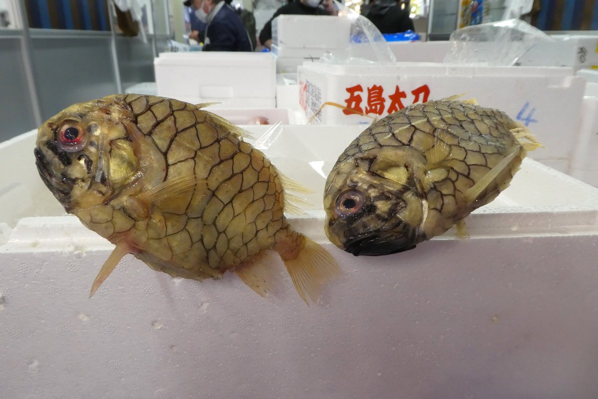 【マツカサウオ】硬くて大きなウロコに覆われ、背びれと腹びれには強大なトゲがあります。名前の通り、その姿は松ぼっくり(松かさ)のよう。下あごには1対の発光器があり、青白色に弱く発光。うきぶくろから音も出します。写真は和歌山県産。調理の際ウロコに難儀しますが、刺身や焼き物などで。
