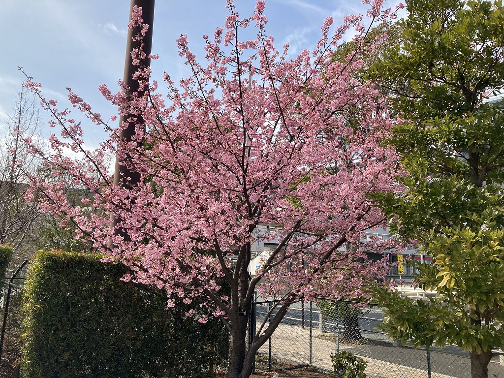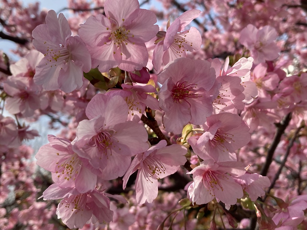 ゆりかもめ青海駅に隣接する水の広場公園では、カワズザクラが満開です。手に届く位置にも花があり、のんびりと一足早い春を満喫できます。