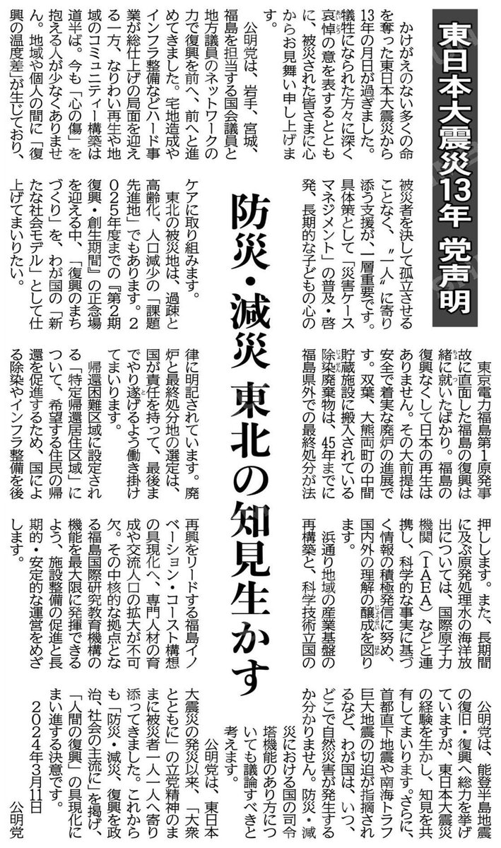 東日本大震災から13年 大槌町に伺った際に、地域の繋がり深さが重要であることを学ばせていただきました。 地域コミュニティの活性化を推進すると共に 防災・減災対策に取り組んでまいります。 (「東日本大震災13年」党声明)防災・減災で東北の知見生かす #公明新聞電子版 2024年03月11日付