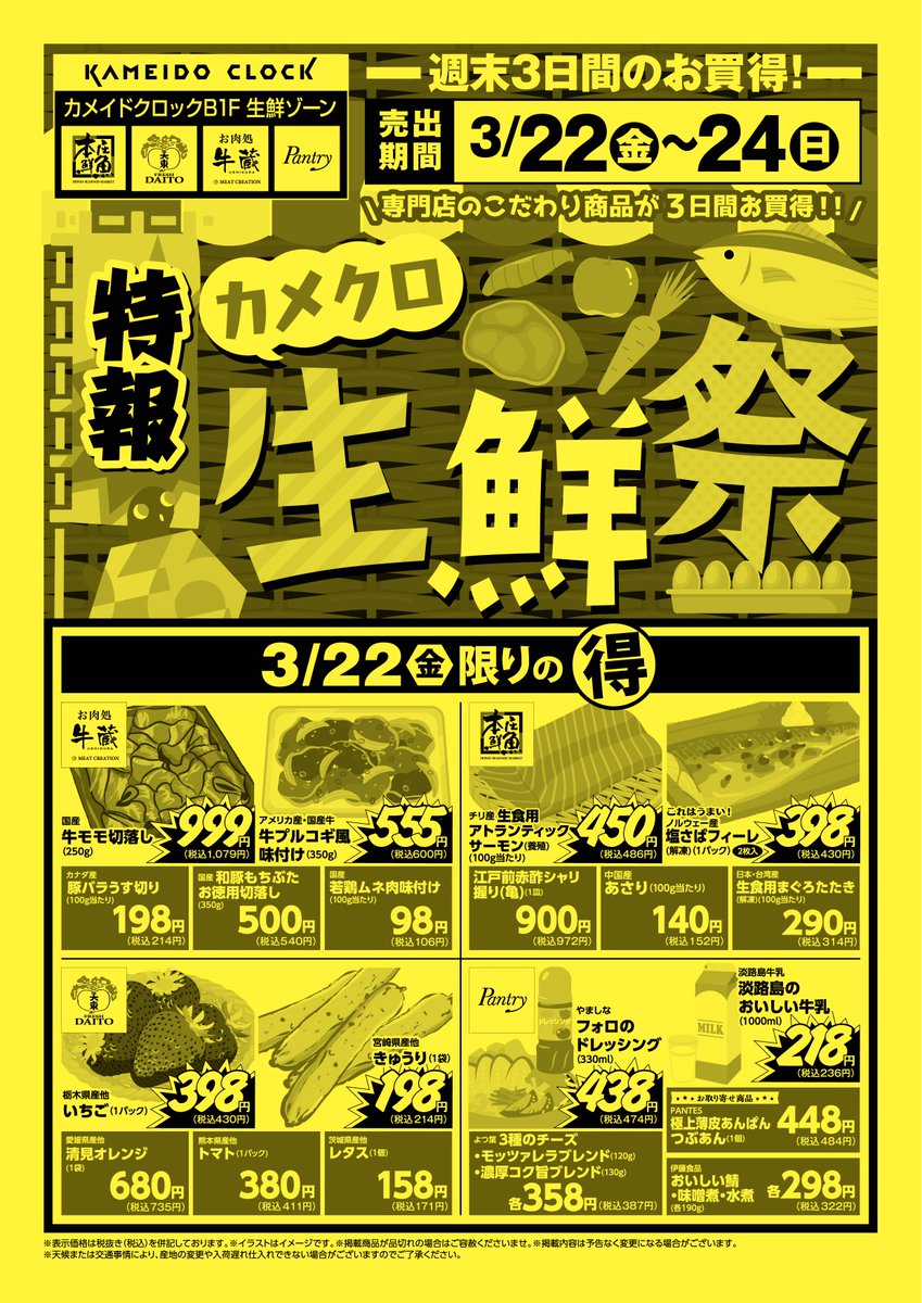 【🐢3/22(金)~3/24(日)🐢】カメクロ生鮮祭が開催!「お肉処牛蔵、本庄鮮魚、フレッシュダイトー、パントリー」にてその日限りのお買い得な商品が多数ございます♪是非お見逃しなく!詳細はチラシをご確認ください🥰 #亀戸 #カメイドクロック