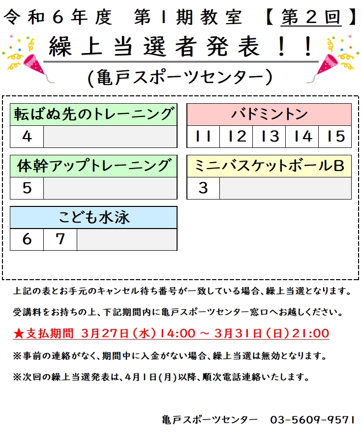 以下のキャンセル待ち番号に該当される方は3月31日(日)21:00までに亀戸スポーツセンター窓口にて入金をお願いします。