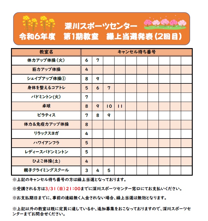 繰上当選された方の番号は添付の画像をご確認ください。受講される方は、3/31(日)21:00までに深川SC窓口にてお支払いください。
