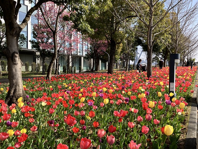 臨海副都心チューリップフェスティバル2024では、300品種の見本園のほか、単色の色で流れをイメージした「流れの花壇」や様々な色の調和を楽しむ「調和の花壇」セントラル広場周辺では、陽光桜との饗宴が楽しめます。来週からはソメイヨシノとの豪華饗宴も楽しめる見込みです