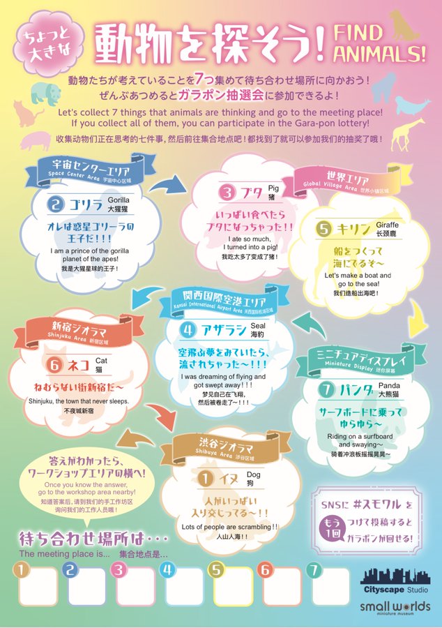 CityscapeStudio×#smallworlds コラボイベント本日より開催中! 6月1日~7月15日 https://smallworlds.jp/pickup/pickup-7308/… #スモワル の住人よりもちょっっと大きい 動物達が隠れている 7匹の動物たちが考えていることを 集めて待ち合わせ場所がどこなのか 探してみよう〜