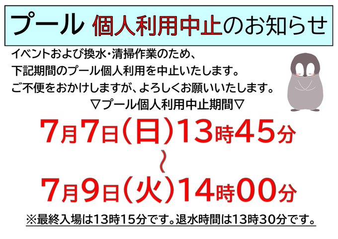 【東砂スポーツセンター プール休場のお知らせ】 7/7(日)13:45(最終入場13:15)から7/9(火)14:00の間、プール個人利用は中止となります。 ※7/8(月)は休館日 ご不便をおかけしてますが、よろしくお願いいたします。