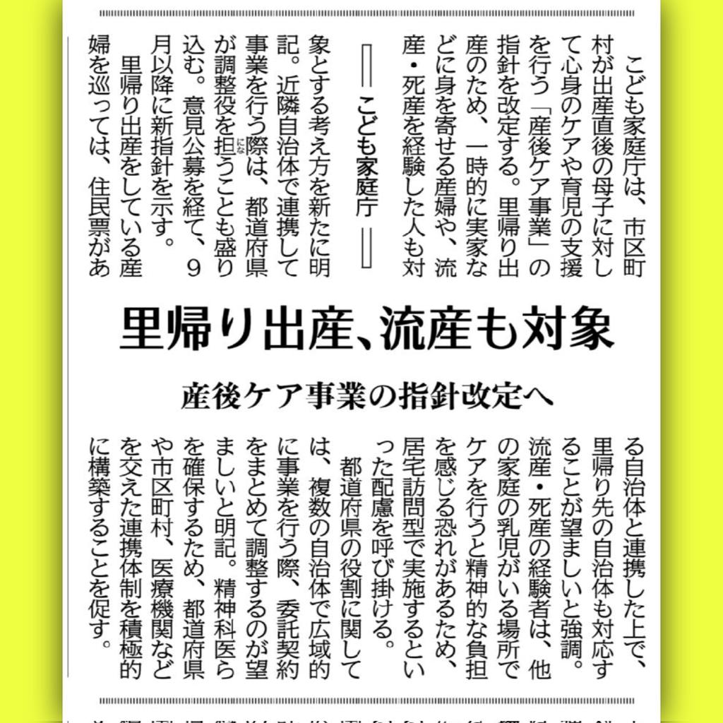 産後ケア事業の指針改定 里帰り出産の方、流産や死産されてしまった方も対象に 出産・育児がどこでもしやすいような環境整備や、流産や死産で辛い思いをされた方に寄り添うケアを市区村町連携し行う。調整役に都道府県 8月18日付公明新聞