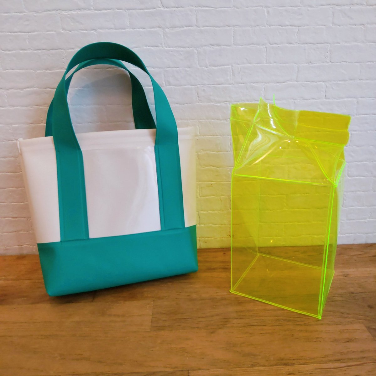 高安ビニール(@takayasuvinyl)さんからかわいいおすそ分けを頂きました😊左は、庇の端材を再利用したトートバッグ。右は、蛍光が鮮やかな牛乳パック型の貯金箱。可愛さに、確かな技術力が光ります✨..