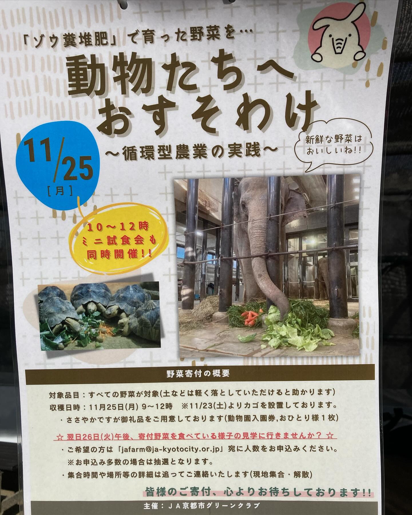 動物たちへおすそわけ〜循環型農業の実践〜11月26日、JA京都市レクリエーション農園利用者は京都市動物園に栽培した野菜を寄付しました。農園利用者に野菜を募集したところ、たくさんの野菜を寄付して頂きまし..