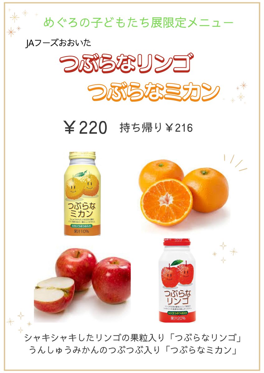 シャキシャキしたリンゴの果粒入り「つぶらなリンゴ」、うんしゅうみかんのつぶつぶ入り「つぶらなミカン」を期間限定で販売中です!ミュージアムショップでもお買い求めいただけます。お土産にぜひどうぞ。