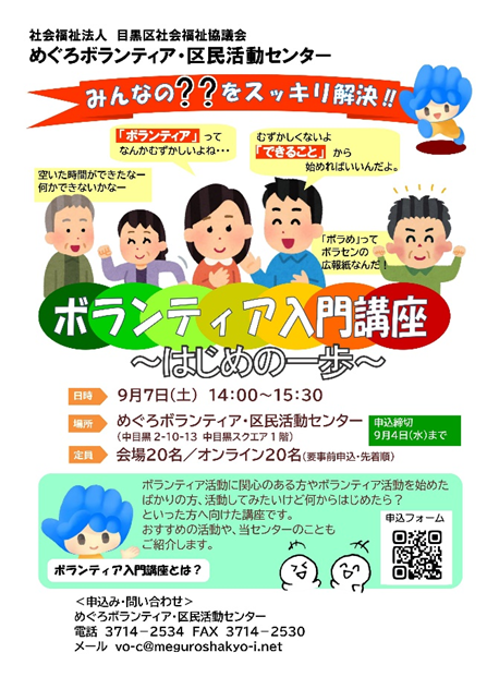 ほほー♪これから何か始めてみたいあなたへ♪9月7日(土)14時~にボランティア入門講座を開催するよ!みんなで地域活動デビューしませんか?詳しくは社協ホームページをチェック! http://meguroshakyo.or.jp