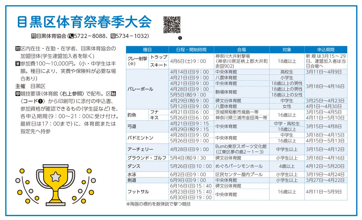/ #めぐろ区報 3月15日号掲載 スポーツイベントのお知らせ \ ■目黒区体育祭(春季大会) 「各区立体育館の教室・イベント」は掲載している他にも募集している場合があります。