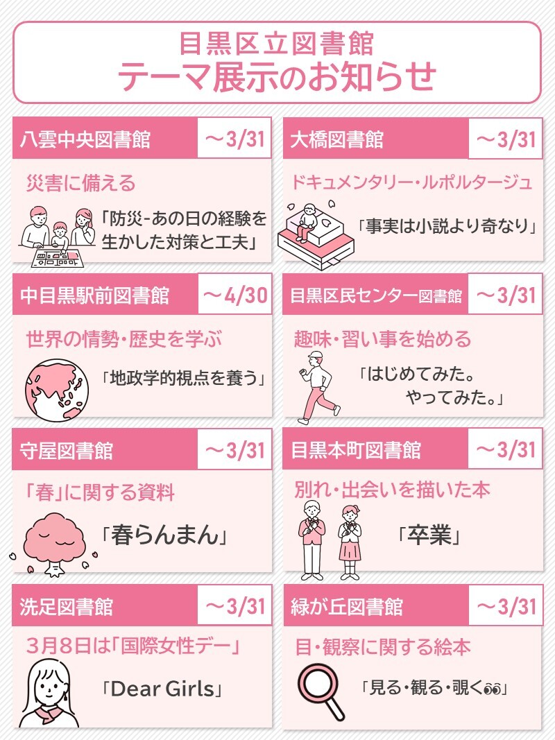 #目黒区立図書館テーマ展示のお知らせ📚各図書館では、テーマに合わせた図書展示を行っています。今月は⚠️災害🏫卒業📝地政学 などぜひ、ご利用ください。www.meguro-library.jp/027