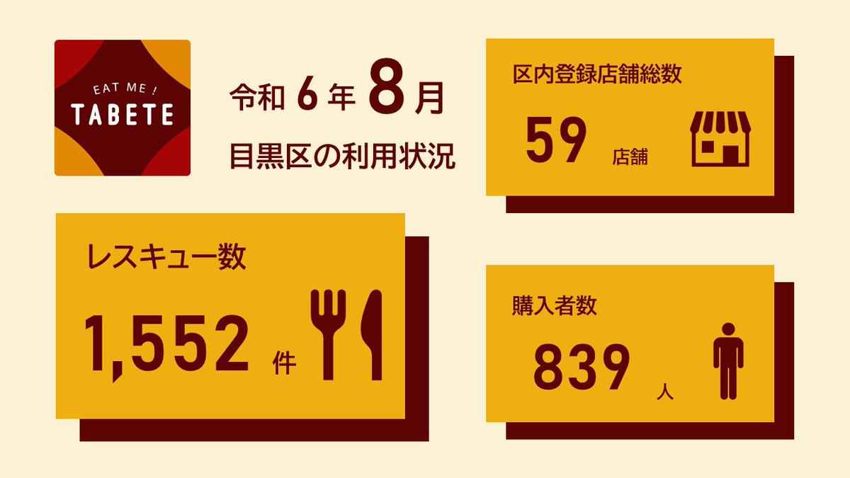 𓌉◯𓇋8月の目黒区フードシェアリング実績𓌉𓇋フードシェアリングアプリ「#TABETE」で、もうすぐ捨てられてしまう食品がレスキューされた件数などをお知らせします「TABETE」を利用して、おいしく#食..