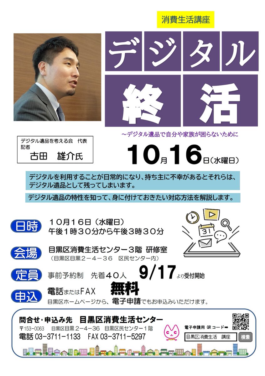 「デジタル終活~デジタル遺品で自分や家族が困らないために」取り扱いが難しいデジタル遺品…デジタル遺品の特性を知り、身に付けたい対応方法を学びます。10/16(水)13時半~15時半目黒区消費生活センタ..