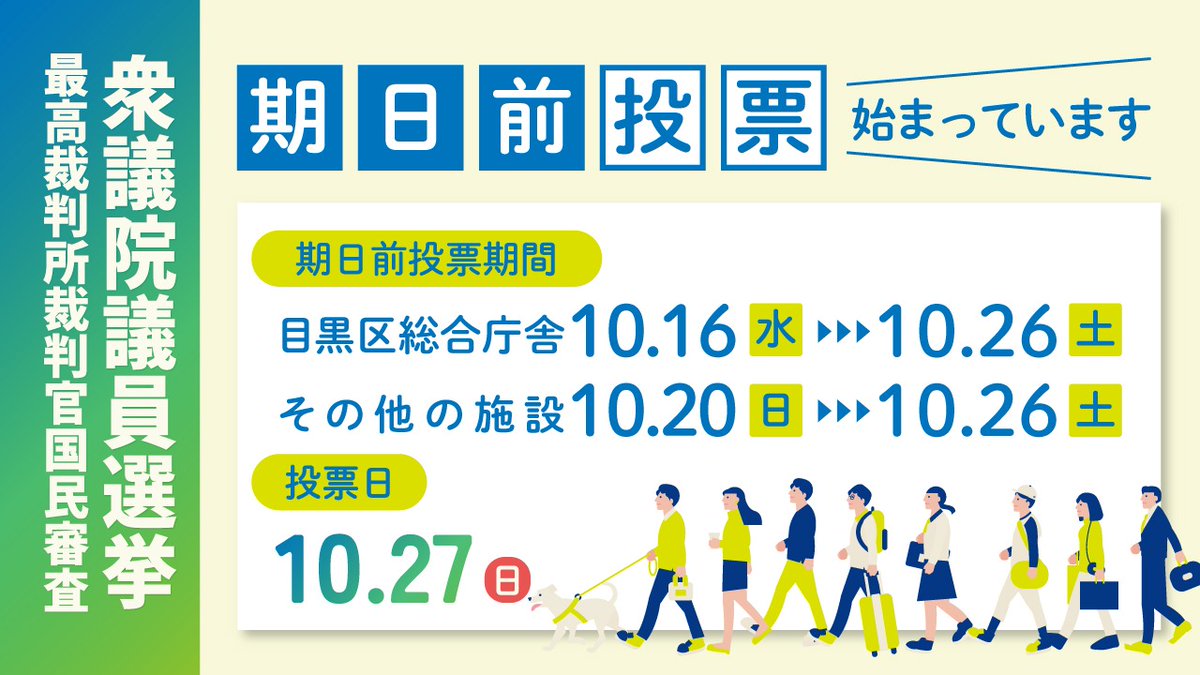 ==10月27日(日)は#衆議院議員選挙#最高裁判所裁判官国民審査の投票日==本日から目黒区総合庁舎で期日前投票ができます。その他の施設は10/20(日)から入場整理券(21(月)~23(水)郵送)が..
