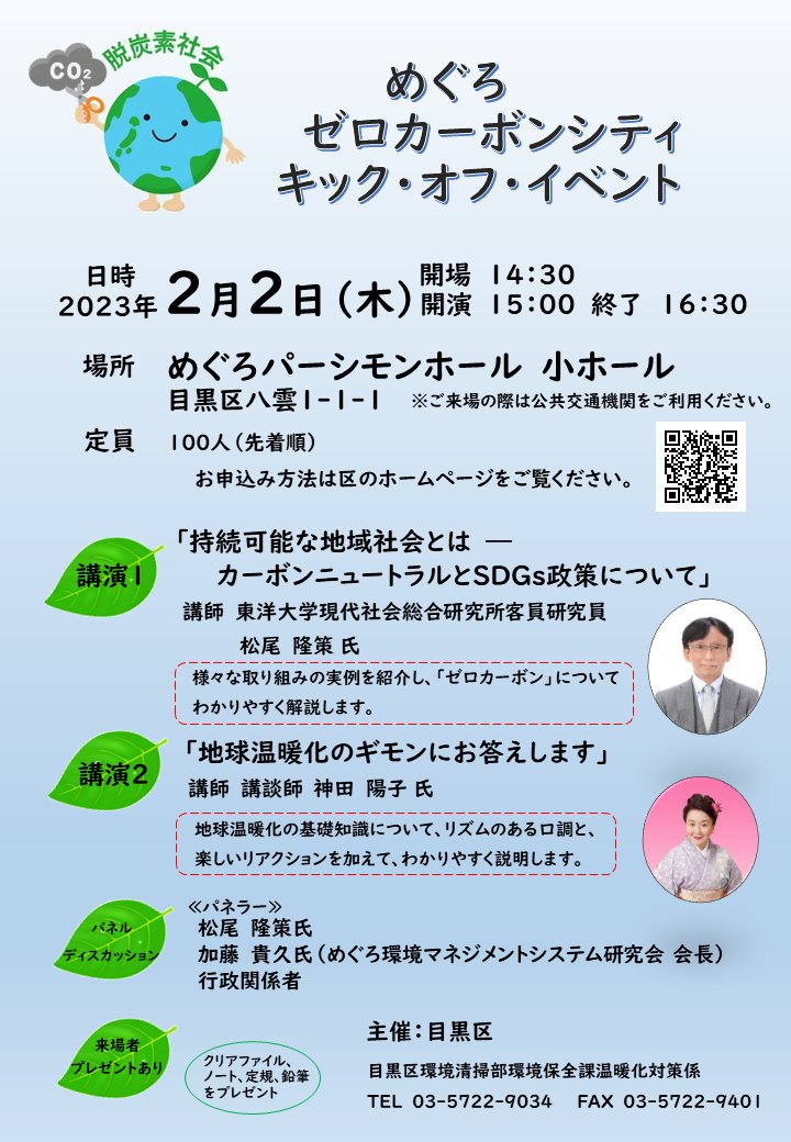 めぐろゼロカーボンシティキック・オフ・イベントを開催します!📅2/2(木)15時~16時半🏢めぐろパーシモンホール#カーボンニュートラルや#地球温暖化に関する講演、パネルディスカッションを行います。🧑..