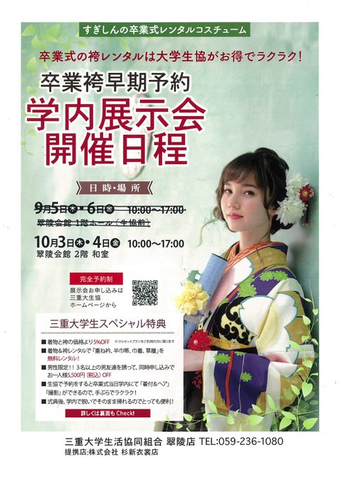 【学内最後のレンタル衣装展示会のお知らせ】日時:10/3㈭・10/4㈮10時~17時場所:翠陵会館2階和室事前予約制です。生協HPよりお申込み下さい。