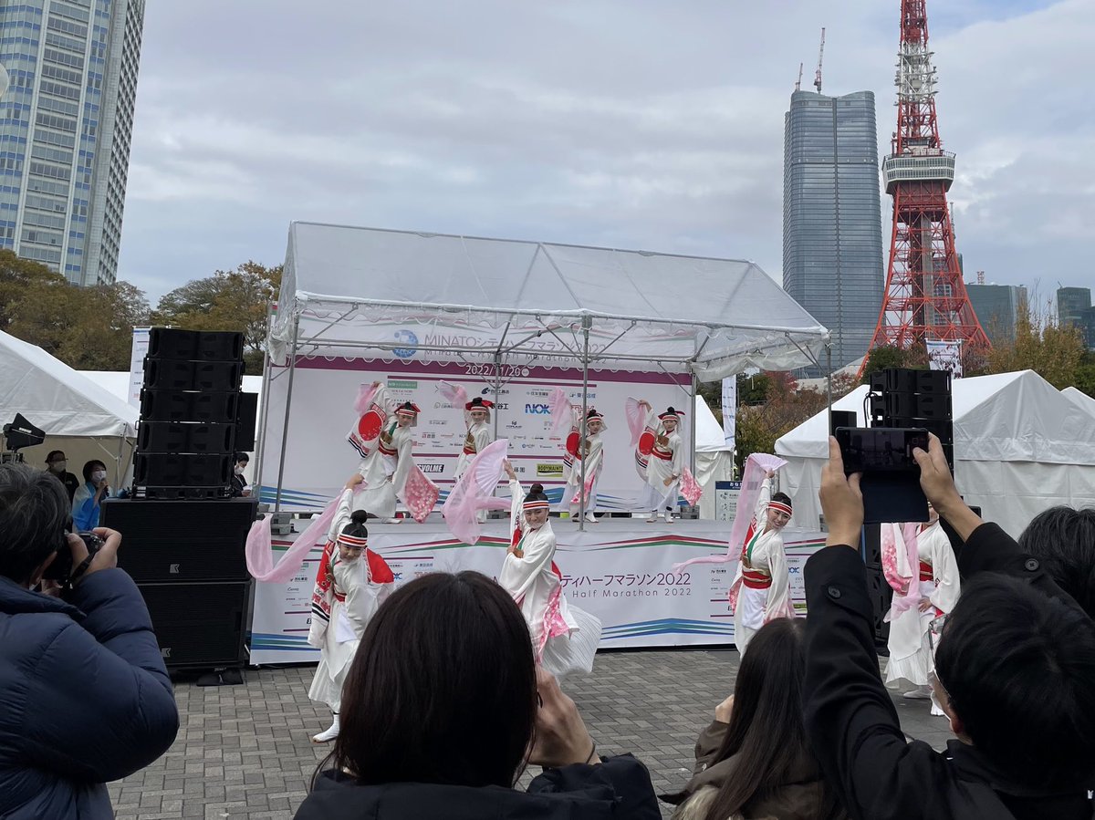 区長のスターターで最初のグループがスタートし、ゴールの東京タワーを目指しました。沿道では、様々な応援パフォーマンスも繰り広げられました。