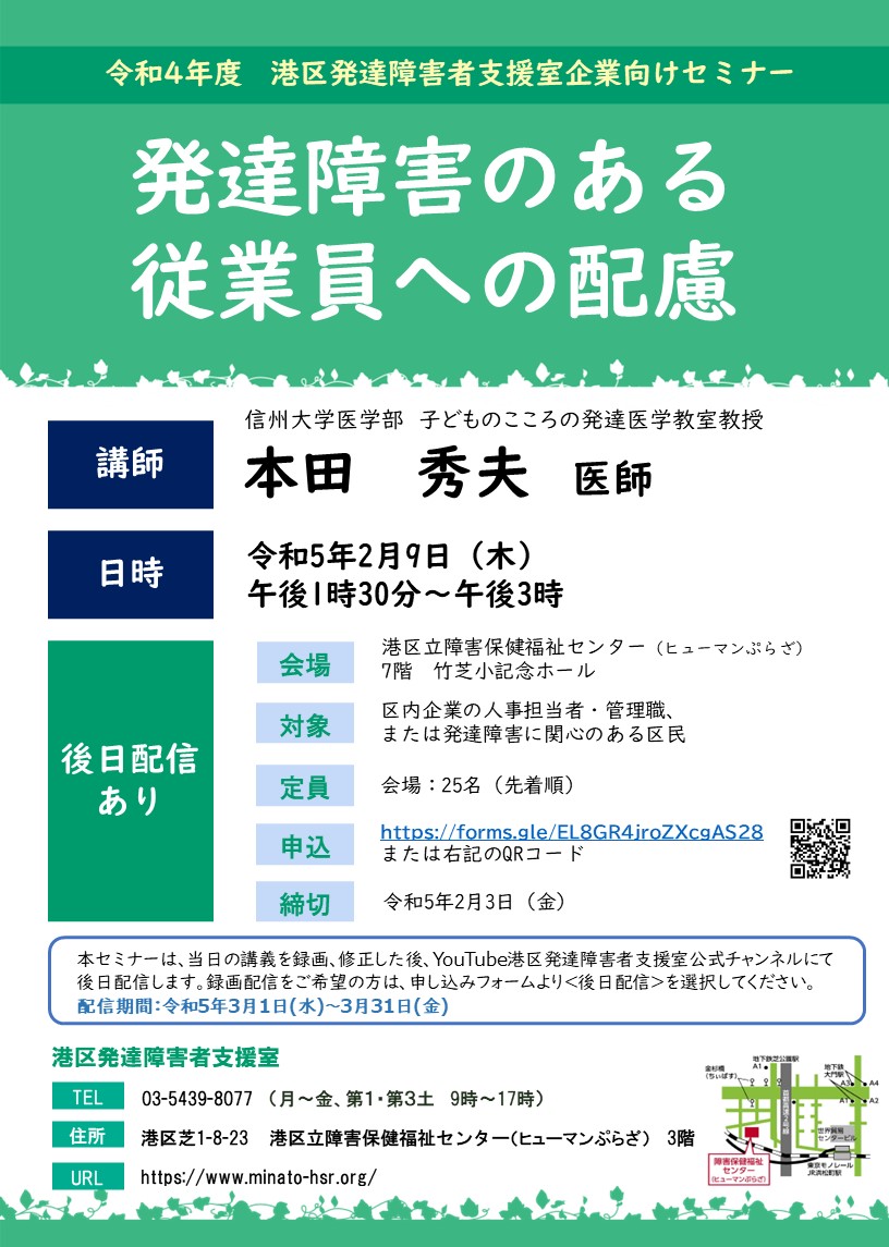 対象:区内企業及び法人等の人事担当者、管理職または発達障害に関心のある区民