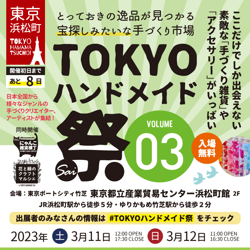 いよいよあと8日!ハンドメイドとアートクラフトの都市型マーケットイベント「#TOKYOハンドメイド祭」開催。vol.3は2023年3月11日(土)・12日(日)、東京都立産業貿易センター浜松町館で開催!#入場無料