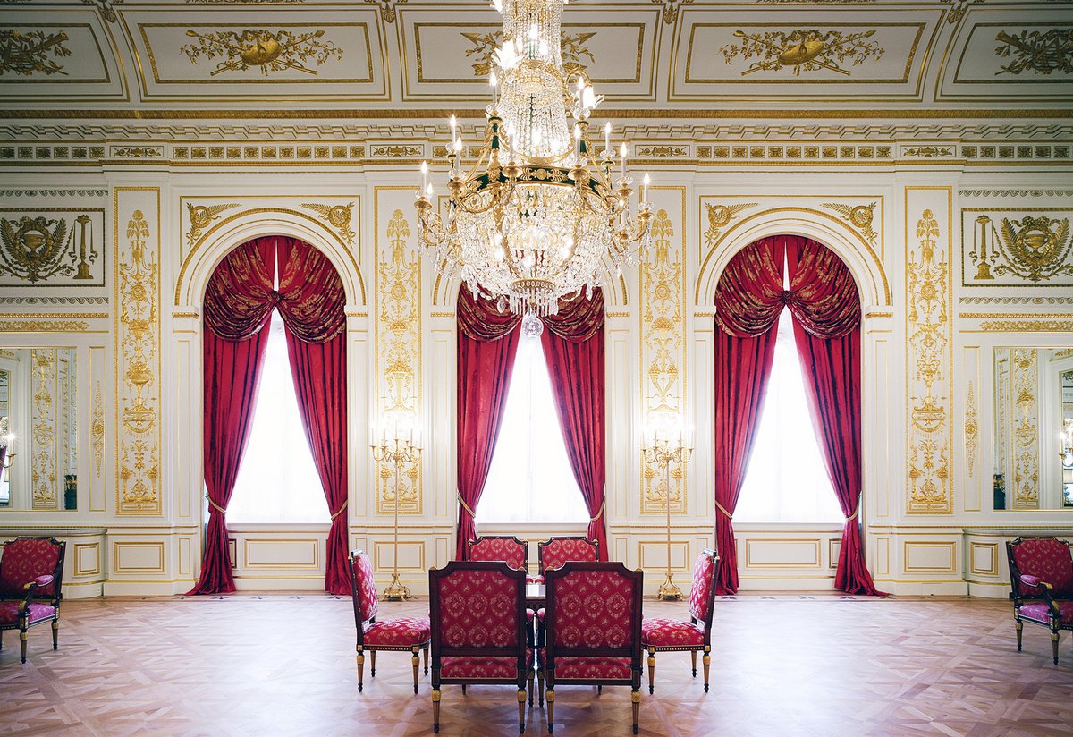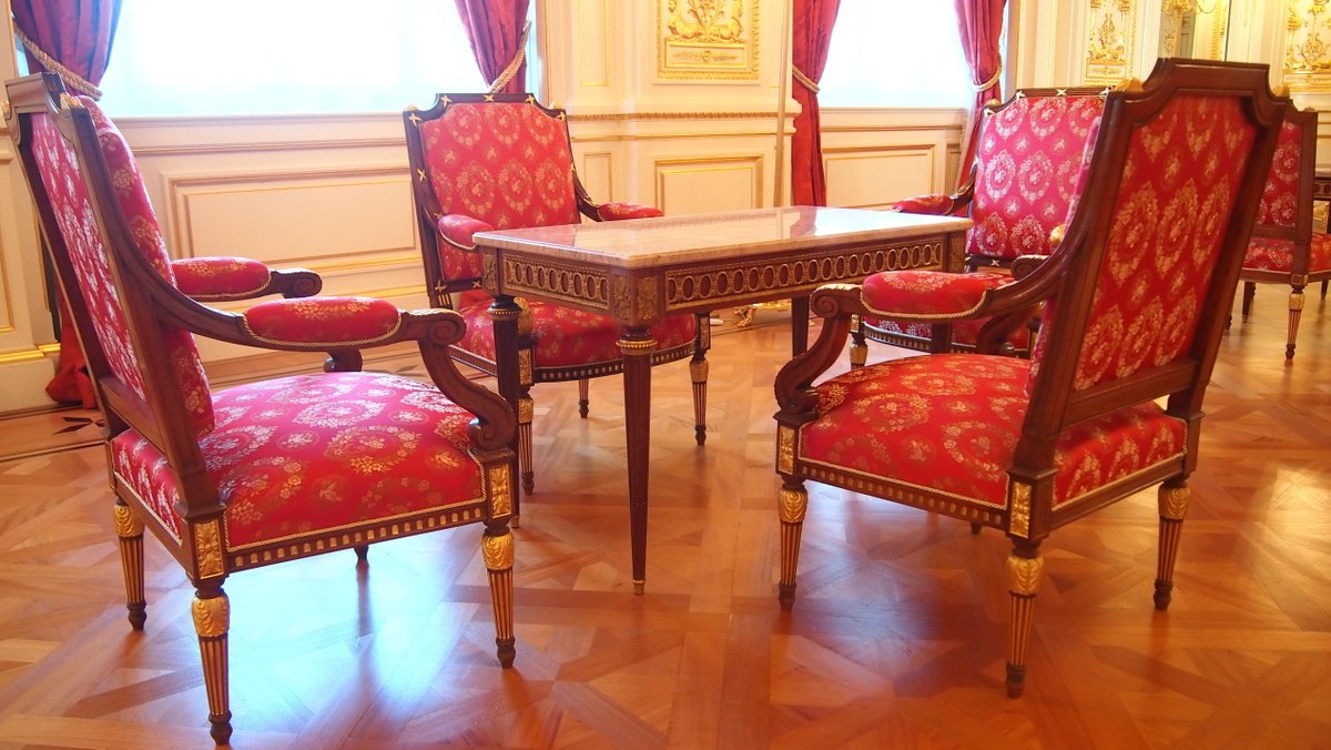#迎賓館赤坂離宮 の #彩鸞の間 には、鮮やかな赤い色のカーテン、深みのある赤の地に銀糸模様の刺繍が入った裂地の椅子が配置されています。金箔や石膏の装飾と合わさって豪華絢爛な部屋となっております。