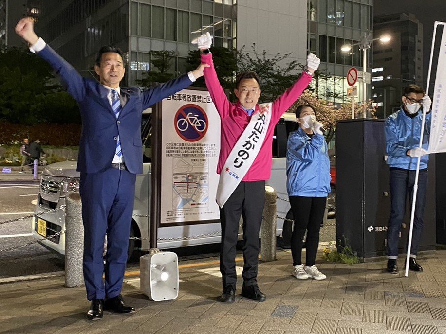 #港区議選 3日目は、途中から喉の調子が悪く😣 しかし何とかしのぎ、最後は岡本三成衆議院議員と共に田町駅芝浦口での街頭演説会を声の限り訴え🗣️ 肌寒い風が吹く中、多くの方々にご参集いただき、またスタッフの方々にも大変お世話になり、最敬礼で🙇♂️ 長男くんや次男くんも、スタッフに混じって📸…