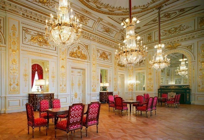 彩鸞の間は暖炉の両脇に飾られた華麗な鳥、「鸞(らん)」が部屋の名前の由来になっています。古代中国の想像上の鳥であり、大鏡の上にも金色に輝く鸞が翼を広げている姿を見ることができます。