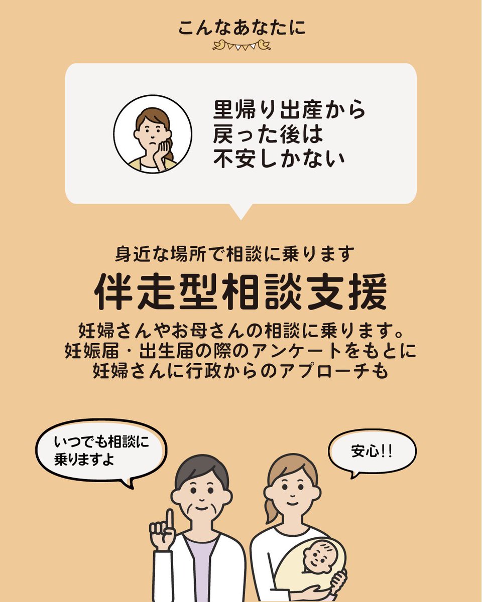 「伴走型相談支援」では、身近な場所で妊婦さんやママの不安な気持ちに寄り添い、相談に乗ります。