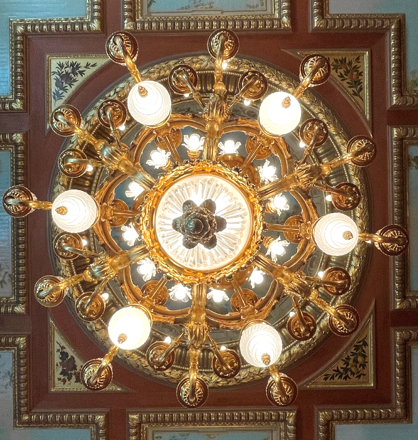 花鳥の間の #シャンデリア。斜め下から見上げると気づきませんが、天井のデザインにピッタリはまっていて見ごたえがあります