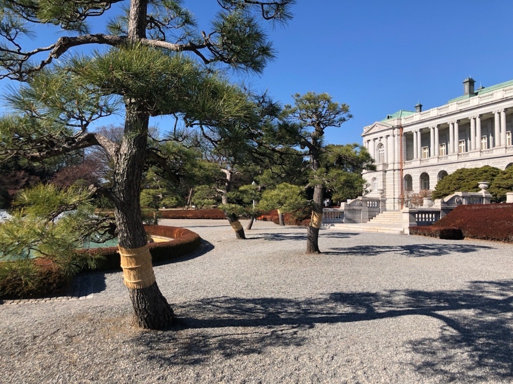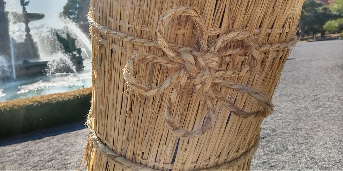 主庭の松の幹にこもが巻かれました。腹巻のように見えるので防寒対策と思われがちですが、本来は、マツの害虫であるマツケムシをこもの中で越冬させ、春になるとそれを焼き払って退治するという害虫駆除が目的です。結び方にも工夫があり、当館ではあわじ結びと梅花結びを用いています。