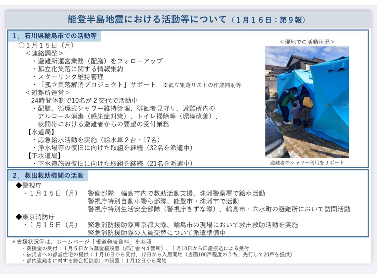 東京都の能登半島地震における 活動状況、15日の内容です。 このように日々、報告されています。 水道や下水道の復旧対応にも職員が かけつけています。 #東京都 #能登半島地震 #復興支援