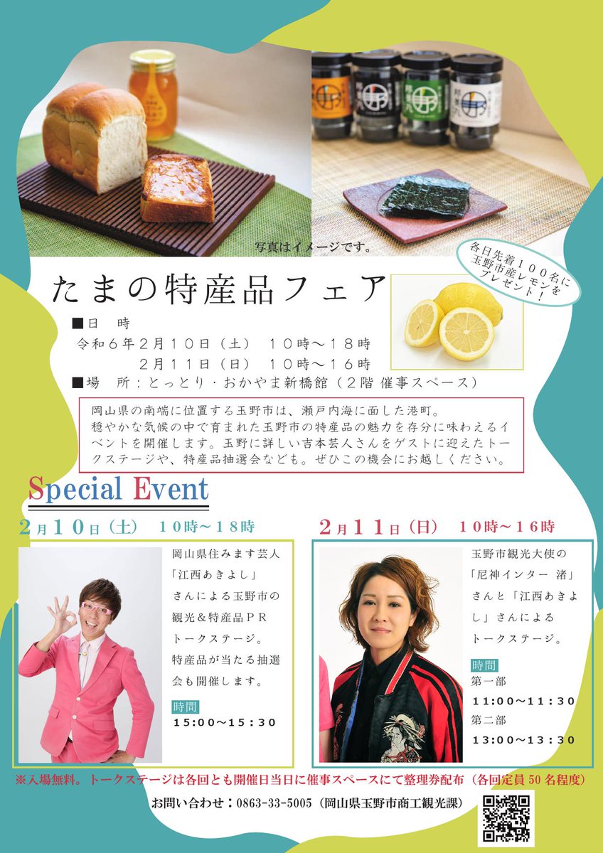 岡山県玉野市の特産品の魅力を味わえるフェアを開催中✨観光大使の「尼神インター 渚」さんと岡山県住みます芸人「江西あきよし」さんによるトークステージを11時と13時に定員50名で実施👍