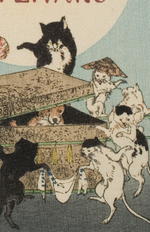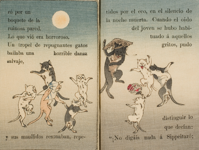 <化け猫が踊る> 2/22 猫の日 あえての化け猫ダンス! 「竹箆太郎(シッペイタロウ)」 アニメ「ゆるキャン△」でこの霊犬の名をご存知の方も? 「シッペイ太郎に知らせるな」と呪文のように唱え 乱舞する化け猫たち。人身御供の娘を食べようと つづらの蓋を開けると霊犬シッペイ太郎!(MT) #貴重書