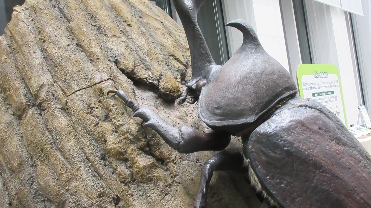 当館入り口付近では、6.3mの巨大オオカマキリがお出迎え✨また、全長1.3mの迫力のある動くカブトムシの模型もございます!