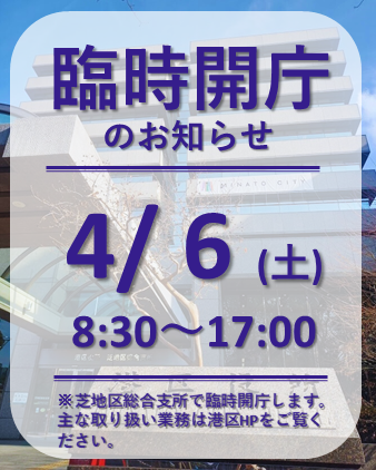 芝地区総合支所では、4月6日(土)に窓口を臨時開庁します。転勤や入学・就職等で引越しされる方はぜひご利用ください。開庁時間は午前8時30分から午後5時までです。www.city.minato.tokyo.jp/shi..